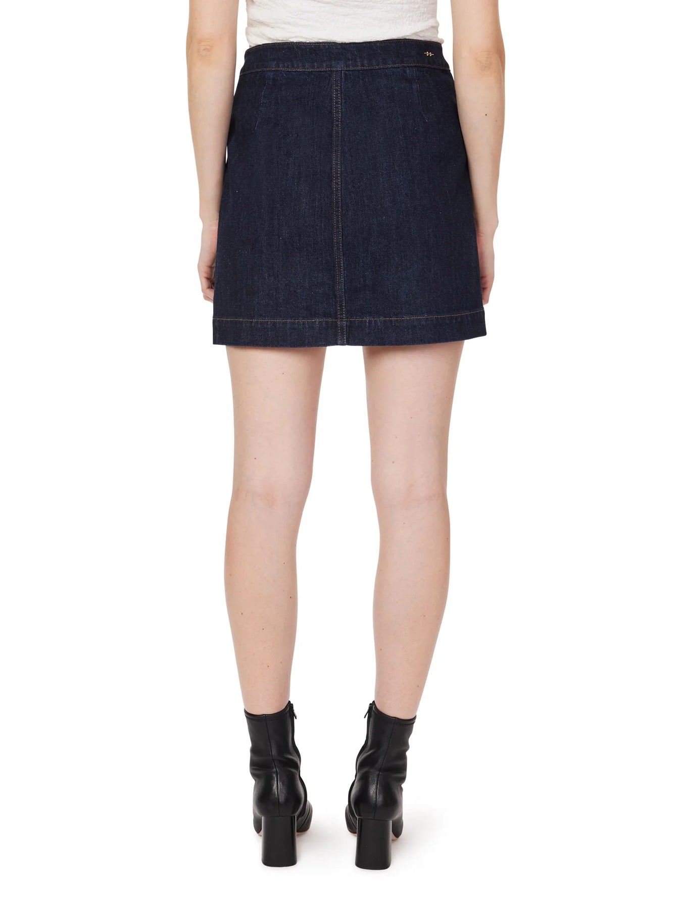 Bulbous golden buttons shine on this everyday jean skirt cut in a leggy length and made in a classic dark wash.